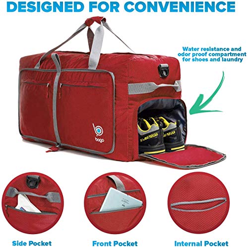 Details: Prevent Emergency Luggage Situations and Save The Day With This Packable Travel and Sports Duffle For All Your Needs. Damaged suitcase in the middle of your trip? Tired of paying for overweight charges? Got carried away shopping for gifts and souvenirs? The Bago Packable Duffle Bag Has You Covered. Why get another bulky luggage when you can have the same packing space without the weight and bulk? Versatile and reliable, bring it anywhere as your "all-around" or "just-in-case" bag. Keep it inside your carry bag and use it for anything... Your gym bag, weekender bag, shopping bag, hospital bag, extra suitcase or "rescue bag" to avoid the overweight limit. A Travel and Home Essential Ensure stress free traveling! Ideal for the On-the-Go Lifestyle The Bago Travel Bags foldable duffle bag is designed for traveling and to carry and store sports gear, equipment or other items. Choose from a 60L bag and up to 100L bag to suit your packing, storage, and traveling needs. With several fashionable colors to choose from, this bag suits anyone in the family. Huge capacity to carry everything you want Durable and reliable for all your adventures and organizing needs Save money since it weighs 75% less than typical luggage Use for hauling sporting gear and equipment Ideal for camping or outdoor activities. XL Duffle Bag for garage or trunk storage. This bag is Super This Duffel bag is super Heavy Duty and can fold up small. It can easily fit up to 3 soccer balls.
