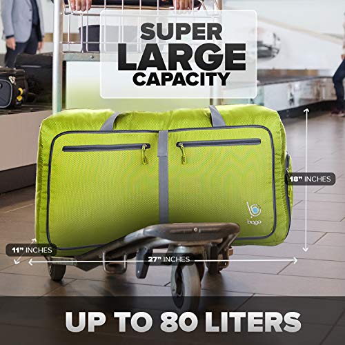 - EVERYONE NEEDS A LARGE TRAVEL DUFFEL BAG: Measures 11x15x27 inches with 80 Liters capacity and weighs 1.5 pounds. Multipurpose: for travel, sports gear, shopping, and organizing. Folds up compact to: 11.8" x 12.6" (30 x 32 cm). Take it along as an extra "Just in Case" bag. Pick your favorite color.