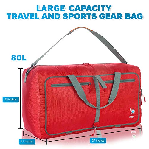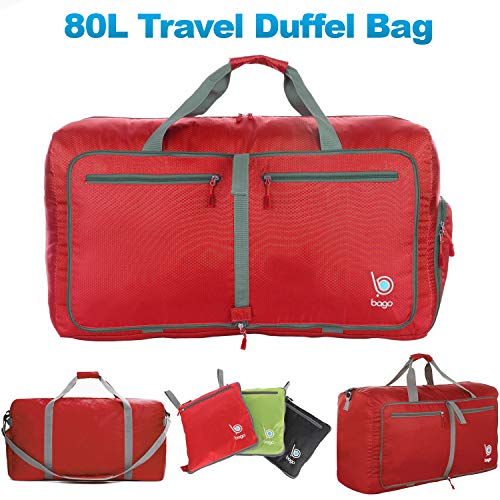 - EVERYONE NEEDS A LARGE TRAVEL DUFFEL BAG: Measures 11x15x27 inches with 80 Liters capacity and weighs 1.5 pounds. Multipurpose: for travel, sports gear, shopping, and organizing. Folds up compact to: 11.8" x 12.6" (30 x 32 cm). Take it along as an extra "Just in Case" bag. Pick your favorite color.