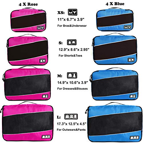 8 Set Packing Cubes, Travel Luggage Bags Organizers Mixed Color Set(rose/blue)