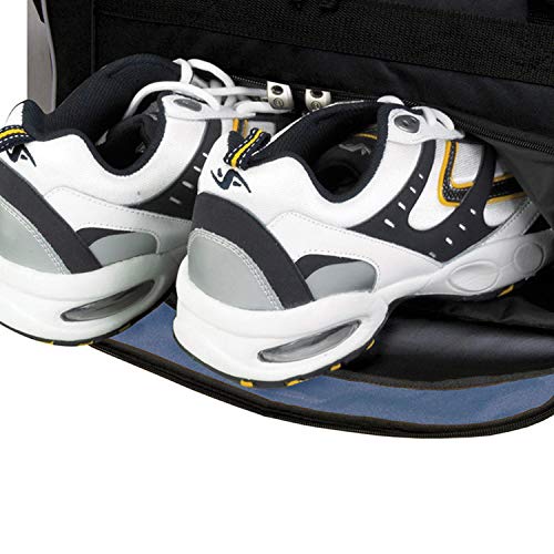 - Exterior front accessory pockets including side wet shoe pocket and ventilation holes. Fully-lined interior with spacious main interior compartment