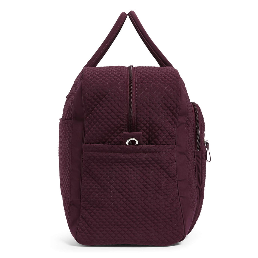 Details: Vera Bradley has thought of everything a great travel bag needs with the iconic grand Weekender - the perfect size duffel to fit everything you need for your next adventure. The iconic grand Weekender Travel Bag is the fashionable solution for storing your travel essentials and packing efficiently - measuring 14.5 inches high, 21 inches wide, and 9.5 inches in diameter. The interior of this spacious Duffel features five mesh pockets. Skip the extra carry on and take advantage of these pockets to organize your cosmetics, hair products, jewelry, and other toiletries. The interior compartment fits about six to eight outfits - perfect for weekend getaway or car trip. The exterior features one slip pocket, a charger pocket, and two zip pockets for stowing your travel essentials - wallet, phone, boarding passes, reading material, and snacks. Keep your most important items at your fingertips with pockets positioned for easy access while keeping them soundly fastened for your flight. The iconic weekender Travel Bag keeps you hands-free so there is plenty of room for adventure. With a 6.5 inch strap drop and a 52.5 inch adjustable and removable strap, You can grab the dual straps on the go, throw over your shoulder for hands-free attention, or utilize the trolley sleeve to attach to your luggage handle so you can be mobile with multiple bags. Whether it's a weekend getaway or a girl's trip, Vera Bradley has designed this necessity for every traveler. Care: Spot clean.
