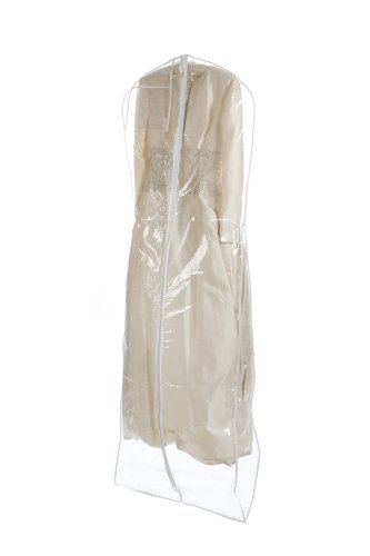 Details: BAGS FOR LESS EXTRA LARGE BRAND NEW CLEAR VINYL, DURABLE, HEAVY DUTY BRIDAL GOWN GARMENT BAG. EXTRA LARGE Bag features a clear vinyl hanging pouch and a full length center zipper with reinforced hanger opening. 10" side gussets add extra room to accommadate any style gown and/or long train. Size of bag is 24" x 72" x 10" EXTRA LARGE Bag is brand new and is made of HEAVY DUTY 4.5 mil Clear transparent HEAVY DUTY vinyl material.Also good for DRESSES pageant gowns and bridesmaid gowns, mother-of-the- bride and formalwear. 4.5 Mil Thickest Bag sold on the Web!