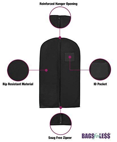• INCOMPARABLY PRACTICAL DESIGN: The Bags For Less garment bag for suits features a 24''x54'' size which in combination with the sturdy, snag free, full length center zipper allows you to easily and securely store your suits and dresses and keep them clean and neat even when you travel.