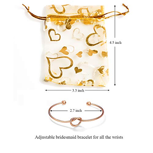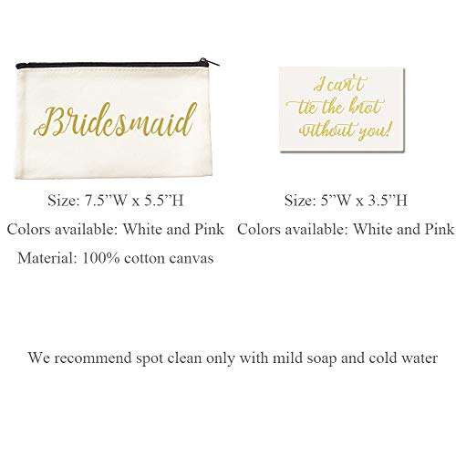 - MAKE GIFT GIVING STYLISH: With the word "bridesmaid" printed in gold and measuring 7.5" * 5.5" this canvas makeup bag is the perfect keepsake for your favorite ladies. Adjustable "Tie The Knot" Bracelet: Express your gratitude with unique bracelet for your "I do crew".