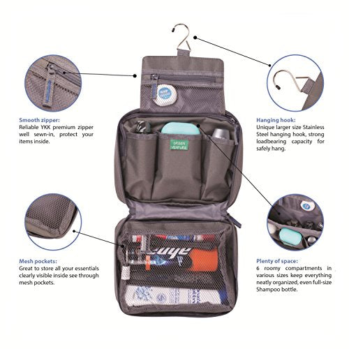 Details: Looking for a compact lightweight bag, Green Venture Travel Hanging Toiletry Bag is the perfect travel companion! Hang in your hotel room on the bathroom doorknob, shower rod or towel rack placed in most bars in United States hotel bathrooms and have all your toiletries right at your fingertips - no more rummaging to find what you need. Hate having to scour through your suitcase to find your toothbrush or razor? Take the hassle out of travel with the Green Venture Toiletry Bag! With 6 roomy see-through mesh & fabric compartments, this sturdy bag gives you a practical solution for packing your toiletries & essentials. Travel frequently for business? Our bag makes it easy to find items while on the plane or at the airport. When you get to your hotel, simply hang it on the towel rack. Excellent professional organizer and a handy travel companion, whether you are going on holiday, for a weekend away or on a business trip, outdoor camping, gym and so much more! This Green Venture toiletry bag can be taken on any trip. Use it as a toiletry bag, to store makeup and beauty items, jewelry bag, first aid kit, or emergency sewing, gym bag, or for traveling. The Green Venture toiletry bag makes a great and stylish accent on every occasion. RISK-FREE! Buy our toiletry bag without risk! 100% Risk-Free Purchase - "No Questions Asked" Money Back Guarantee.