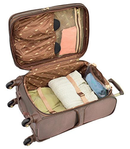 - 8 low profile recessed spinner wheels, spinners expand 2" for additional packing capacity, ID pocket with multiple color cards, self repairing nylon zippers