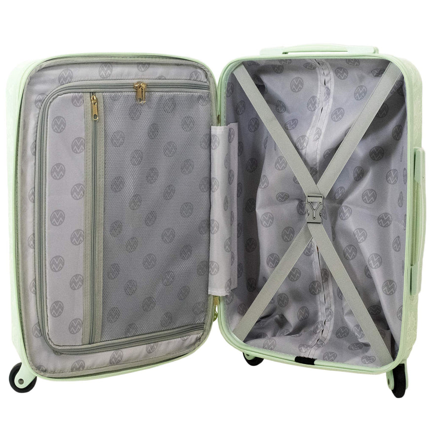 Details: Bring the elegance of lace along with you for your travels with the Macbeth lace texture hard sided 2 piece luggage set.  It comes with a 29 inch and 21 inch suitcase that nest within each other when not in use. It is made with durable polycarbonate material that will stand up to the rigors of travel. This lightweight luggage easily rolls around with smooth 360 degree multi-directional spinner wheels. You can roll around in style and comfort with a multi-stage telescopic pull handle that has a gold metallic finish. A full body main compartment has the space you need for clothes, souvenirs, and other travel essentials, while built in compression straps let you pack more and help prevent clothing spills while on the go. It also includes a built-in interior zipper mesh compartment that lets you secure and organize your travel bottles and cosmetics. The luggage has an 2 inch expandable zipper gusset that lets you pack more and expands your space. It is easy to load into overhead bins and cars with retractable top and side panel handles.