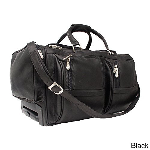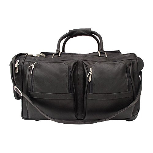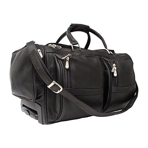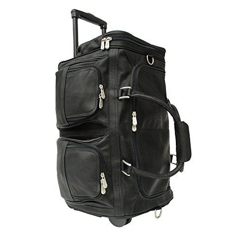- Pocketed duffel bag in full-grain leather with telescoping trolley handle and internal wheel trolley for easy rolling