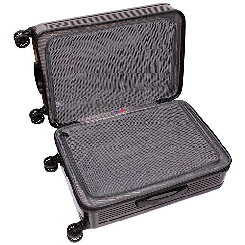 - Recessed TSA Lock with #10 Oversized Zippers on Main Compartment Lock Placement on Top American Made 100% Polycarbonate Multi Directional 360 Degree Smooth Technology 8-Wheel Spinner System Double Mesh Zipper Compression Compartments 22IN. X 15IN. X 10IN. 6.9 LBS., 26IN. X 18IN. X 11IN. 9.5 LBS., 32IN. X 20IN. X 12IN. 12.1 LBS.