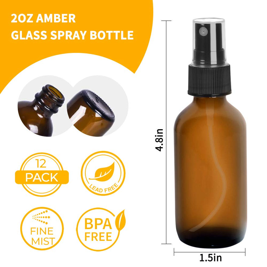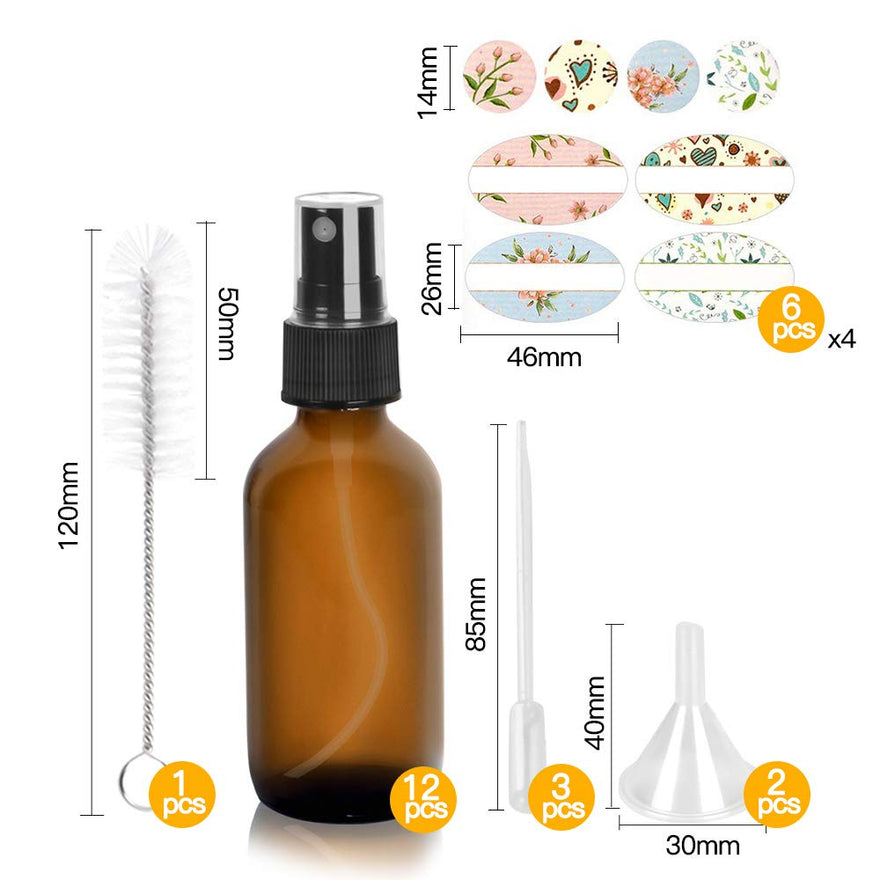 - Package Include: 12 Pack 60 ml Amber Glass Bottles,14 Fine Mist Sprayers & Dust Cap ,1 Brush,2 Plastic Funnels,24 Labels and 3 Plastic Droppers