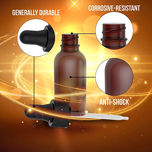 Each amber glass bottle in our pack comes with UV protection, a durable glass construct, and a tight cap that is fitted with a dropper for easier dispensing of the product.
