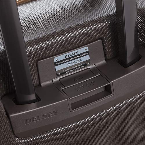 Details: This 28" Spinner Trolley is part of the Delsey® Chatelet Collection. Travel can now be practical and look sophisticated with the polished Chatelet 28" Spinner Trolley. Constructed of 100% BAYER Makrolon® polycarbonate material. Telescoping handle locks in two positions to accommodate two or four-wheel use and is designed for maximum comfort and control with molded ergonomic comfort grips. Additional top and side handles allow you to easily lift the loaded case into an airplane's overhead bin. Integrated three-dial TSA-approved combination lock keeps items safely locked away during travel. Fully lined interior with two compartments and adjustable web straps for organized packing. Interior also includes a garment compartment with hanger and removable pouches for packing toiletries and small items. Four 360° Japanese Hinomoto® spinner wheels provide a silent and smooth roll. Stop and Go brake system prevents bag from rolling away, while still allowing it to roll on two rear wheels. Imported. Measurements: Width: 20 in Depth: 12 1⁄2 in Height: 27 1⁄2 in Weight: 12 lbs 9 oz