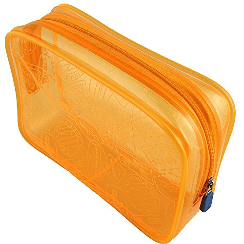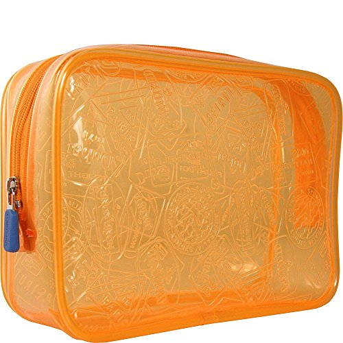 Details: Embossed stamps add well-traveled whimsy to a transparent neon Flight 001 toiletry bag. Zipper top.