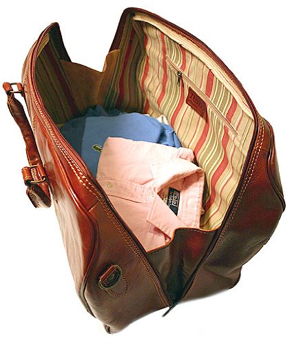 Details: Roma Duffle is made with full grain Saddle Brown vegetable tanned Italian calfskin leather and finished with a smooth brass zipper. A truly classic leather duffle that will never go out of style - it fits nicely into an airlines overhead compartment. The floor-to-floor zipper makes packing easy and painless - imagine no more stuffing and wrinkling clothes through a tight opening! The interior of this travel bag is lined with rugged 100% Cotton/Denim so your clothes will always unpack smelling fresh. This piece of luggage also has an inside zip pocket for holding a passport and travel supplies.