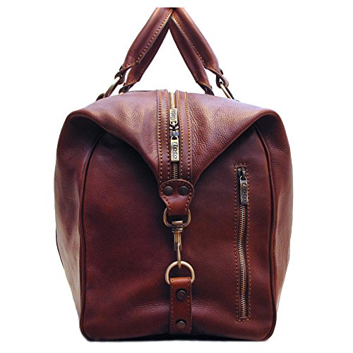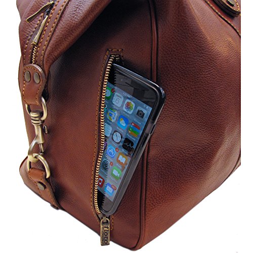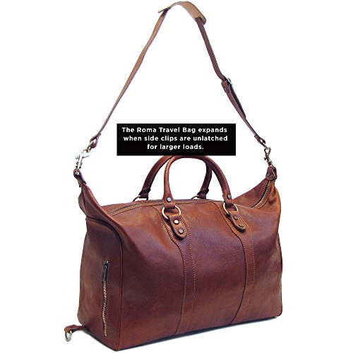 Details: The expandable Roma Travel Bag is made with full grain Saddle Brown vegetable tanned Italian calfskin leather and finished with a smooth brass zipper. When the end clips are latched to the bottom this bag is 12" x 11" x 21" - it expands unlatched for larger loads. Two fast access zip pockets are big enough for any size smartphone (8" x 8"). The sleeve pocket comes in handy on the go (6" x 9"). The interior of this travel bag is lined with rugged 100% Cotton/Denim so your clothes will always unpack smelling fresh. This piece of luggage also has an inside zip pocket for holding a passport and travel supplies.