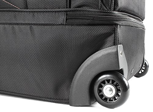 - Duffel bag is mobile on smooth corner mounted wheels for hassle-free transportation.