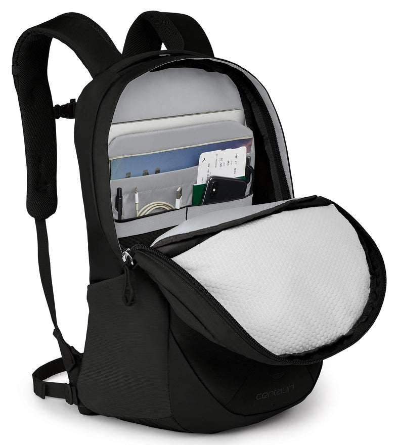 Details: The Osprey Centauri laptop backpack is a feature rich daypack. Starting with the front panel organization pocket where you can store your pens and cords along with a key clip for security. The Centauri bag has a padded laptop sleeve that can fit up to a 15-inch laptop. It also has a separate zippered tablet sleeve and magazine/document sleeve. You can then ensure you stay hydrated on a busy day with dual stretch mesh water bottle pockets. It can also be used as a bike commuter pack with the blinker light attachment and a heat embossed scratch-free slash pocket for your sunglasses.