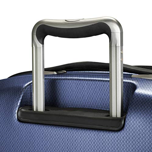 - The polycarbonate alloy exterior resists damage from impact. This lightweight material has also been texturized for scratch resistance. Patent-pending multistage retractable handle fits ergonomically in hand to get around easily with less arm fatigue. Bottom grip and top and side carry handles with soft-rubber grips promote easy lifting and positioning.
