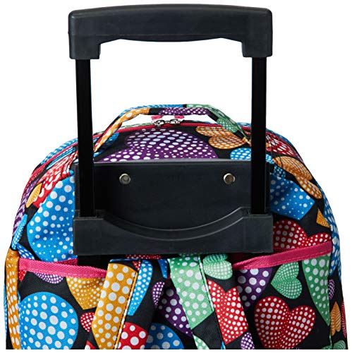 Details: Rolling backpack with double skate wheels. Measures 13 inch lx10 inch wx17 inch h. Features include 2 zippered pockets on the front of the bag with one having a built in organizer. Zippered main compartment opens to large storage opening, and two mesh side pockets. Fabric handle at the top and telescoping pull handle. Bag made of durable polyester with metal telescoping handle and heavy duty plastic stand on bottom to keep the bag standing.