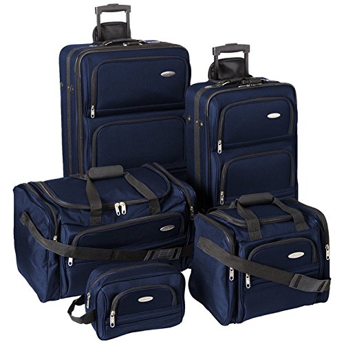 Details: This set contains 5 different sizes to fit every travel need, including a 26" upright, a 22" carry-on upright, a travel duffel, a travel tote, and a toiletry kit. 10 Year Warranty. The Samsonite 5-Piece Travel Set is a comprehensive luggage set that even includes a toiletry kit. There's room for everything in the four luggage styles: boarding tote, duffel, 22 wheeled carry-on, and 26 wheeled packing case. The exterior is made of a durable 1200 denier polyester and the interiors are fully lined.