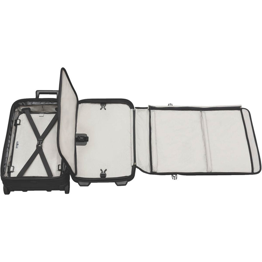 - Vertical X-shaped compression straps hold clothing securely in place when bag is tilted upright helping to reduce wrinkles
