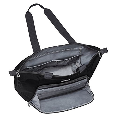 - Travel tote bag with elongated top handles, lockable zippers, and incorporated luggage tag