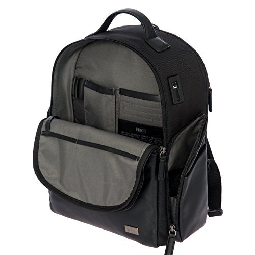Details: The MONZA Collection is made up of 3 backpacks, a briefcase and a toiletry kit/shave case, with design and function at the forefront. This collection is constructed using a mix of lather and technical nylon - accented with a gunmetal logo and gunmetal finishes to keep a clean aesthetic.. The Medium Laptop Tablet Business Backpack provides great ease of access and organization of your contents. Within, it has several organizational compartments to hold all your personal and technical essentials, necessary for everyday use or travel. In addition, this backpack provides access to a USB connection for your battery packed as it is housed within the bag white still having the phone in-hand or stored elsewhere within the bag.