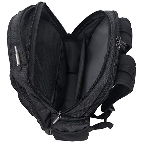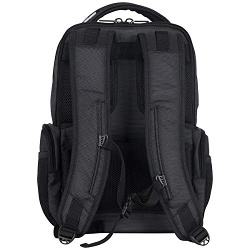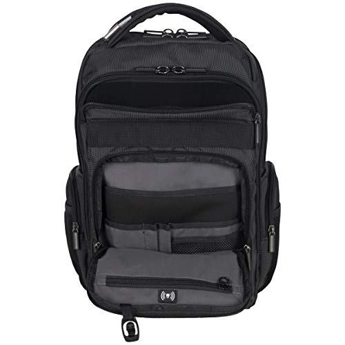 Details: Rfid blocking technology in organizer pockets helps prevent electronic theft. Laptop pocket is padded to fit most laptops with up to a 17.0" Screen. Tablet Pocket is padded and compatible with most tablets. Durable, 1680D polyester exterior with secure top zip construction and fully lined interior. Front exterior features an upper zipper pocket softly lined to hold valuables and an RFID protected zip down organizer with room to hold a variety of business essentials. Front compartment interior Includes two zippered mesh pockets, an open accessory pocket, and a padded tablet pocket. Center compartment interior features a zippered mesh pocket, multiple open accessory pockets, and a gusseted file pocket, leaving plenty of room to store any other needed belongings. Rear compartment is fully padded to hold and protect your laptop. Dual side exterior feature zip around and elastic open top mesh water bottle/ accessory pockets. Easy to grab front exterior webbed loop and sturdy top handle. Rear exterior features a padded back panel, a trolley tunnel that fits over most luggage upright handles for hands free carrying. Shoulder straps are padded with air mesh, adjustable, and include securely buckled sternum straps. Overall Dimensions: 18.0" H x 12.0" L x 7.0" D; laptop pocket Dimensions: 16.0" H x 11.0" L x 1.0" D; Weight: 3.3 lbs. Includes a lifetime limited manufacture warranty.