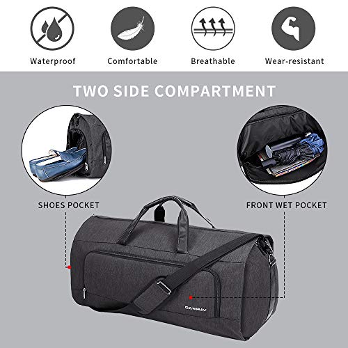 - 60L DUFFEL BAG - Compared with other 45L garment duffle bag, this Suit Travel Bag has a larger capacity up to 60L so that it can hold more things from suits, dresses to shoes and ties for one week trip. Separate waterproof shoes pocket design helps you place the shoes and clothes separately, which protects your clothes from wet and dirty and make your trip more enjoyable