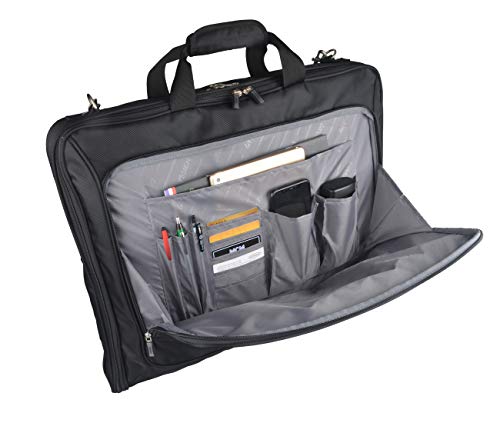 Details: Special Design for Travel, Easy Access and Quick Packing GYSSIEN garment bag has designed to meet function. it can hold up to 3 hangers. Just taking your suits out from the closet and hanging on the bag clamp,then zipped it. 5 interior mesh bags and 1 shoe bag for folding clothes, underwear and toiletry accessories. 1 front pocket for laptop, documents, passports and etc. all items in its right place, very easy to check at airport. Also, it is flexible to put in overhead bins Clothes Keep Neat and Wrinkle Free, Always Ready to Use The secure clamping system to hold up to 3 suits. With the considerate cross tie and buckles, your suits will be fixed in place, no crease, no wrinkle. Also, other necessaries like shirts, belt, shoes are very easy to find in the see-through mesh bag. Your clothes will arrive in perfect condition and always ready to use. Durable Material Stylish Unisex Design for Long-lasting Use With the unisex design, both men and women can travel in style. Also, husband and wife can share one carry on bag if their schedules are not conflicting. Constructed from reinforced 1680D polyester, the bag is very durable for years of use. Smart Organization with Separated Pockets to Maximize capacity folded bag dimension: 22x18 inch suit bag dimension: 42X22 inch 1x main suit pocket 1x front pocket 1x shoes pocket 5x interior pockets