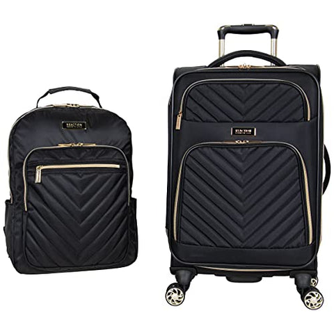 Kenneth Cole Reaction Women's Chelsea Luggage Chevron Softside 8-Wheel Spinner Expandable Suitcase Collection, Black, 2pc Bundle (Carry On+Backpack)