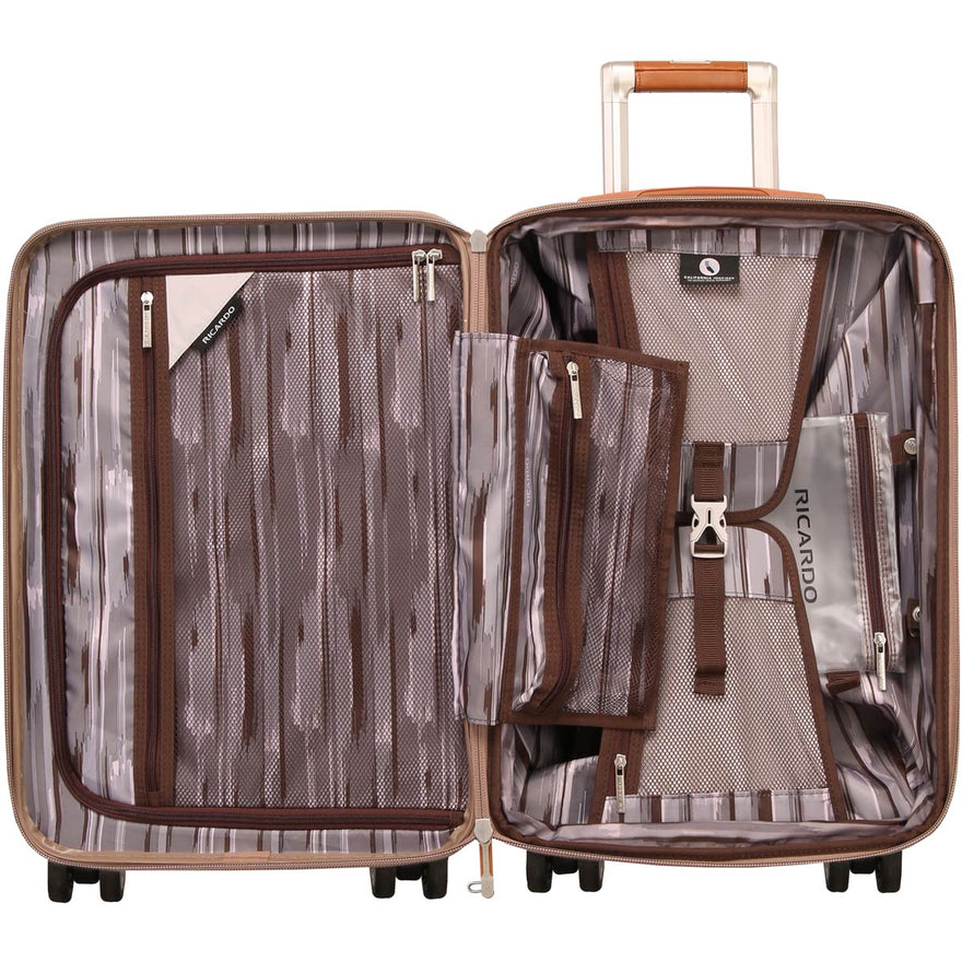 Make a memorable first impression with this sophisticated carry-on spinner, a great short-trip option from the Ocean Drive luggage collection. Equally appropriate for business or pleasure, itrsquo;s packed with storage features that deliver smart organization without compromising its generous capacity. The tough Makrolon polycarbonate construction resists dings and abrasions. A TSA-compliant combination lock protects your valuables. Sturdy, smooth-motion wheels, an ergonomic handle and extra-grippy top and side handles deliver effortless maneuverability along concourses and in and out of overhead bins.