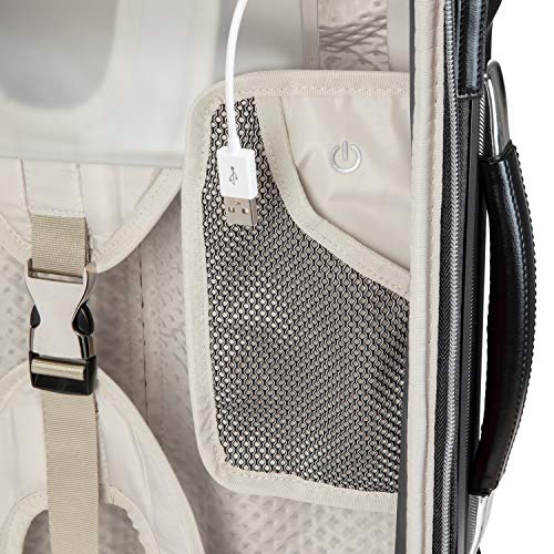 • Spacious main packing compartment, Premium, soft-touch lining and interior components, Pouch for removable battery (Not Included) Internally routed cord to USB port, Adjustable compression wings, Snap-out TSA-friendly toiletries pouch