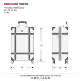 • DIMENSIONS: Packing Dimensions: 19” x 14” x 9.5”; Product Dimensions (includes wheels and handles): 22.25” x 14.5” x 9.5”; Weight: 7.4 lbs.