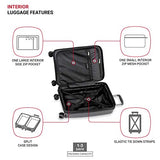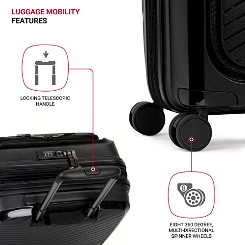 Details: A sleek, stylish case, the SWISSGEAR 8836 20” Expandable Laptop Carry On Hardside Spinner Luggage is bringing modernity to your wanderlust journey. Propped on eight 360-degree spinner wheels, its front zip compartment features two slip pockets, a small zip pocket, and a 15” laptop sleeve with a protective hook and loop closure. Unzip its split-case design to find elastic tie-down straps, a large side pocket, and a mesh pocket to organize outfits and travel essentials. For added security, its TSA locking system includes a three-digit combination and locking zippers that pops open with a push-button. Lift its locking, telescopic handle or grab its supple molded handle and revel in a seamless adventure.
