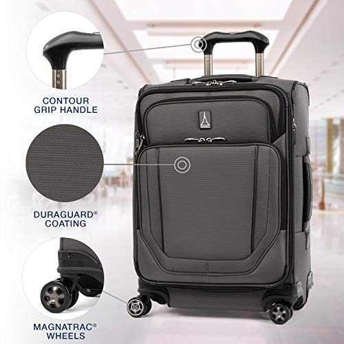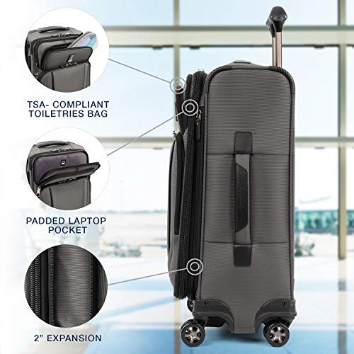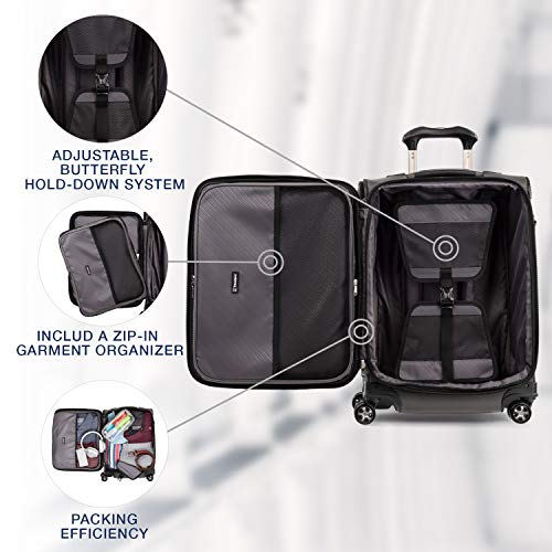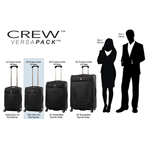 Details: Pack to the max with luggage that is truly all your own. The max carry-on expandable spinner is designed for total packing versatility and customizable with a variety of interchangeable Travelpro exclusive zip-in organizers. Included inside the lid is a removable zip-in garment organizer, ideal for storing folded shirts, dresses and jackets. Also available for purchase separately are four additional coordinating Travelpro exclusive zip-in organizers-a laundry organizer for bathing suits, workout clothes and other damp items, A packing cubes organizer for shorts, shirts and accessories, A suitor organizer to keep hanging clothes wrinkle-free and an all-in-one organizer for wet and dry storage (each sold separately). created for domestic travel on larger aircraft, this bag is sized to max out the sizer bin and fit In the overhead bins of most major yours. Airlines. It also features a tip-resistant zippered expansion to increase packing space up to two inches, but be careful not to overpack the exterior pockets and risk making it too big for the sizer bin. Enjoy total convenience with a built-in USB port and dedicated exterior power bank pocket, exterior padded laptop pocket and removable TSA-compliant toiletries bag that stores perfectly in a same-sized exterior pocket. Plus, this spinner's precision glide system ensures precise control and effortless roll on eight ultra-durable, 360 degree magnatrac spinner wheels led by a four-stop, height-adjustable PowerScope handle with comfortable Contour grip. Built for professional-grade dependability With robust corner armor, skid guards and heavy-duty wheel housings, crew versapack is the civilian version of the luggage flight crews use, tested to meet the same superior quality and durability standards. This spinner is further backed by the comprehensive built for a lifetime limited warranty with our trusted companion promise.