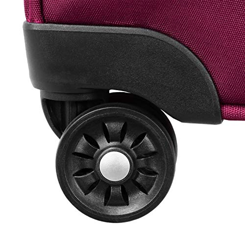 - Eight recessed 360 degree multi-directional Spinner wheels, ergonomic comfort grip locking trolley handle and convenient top, side and bottom carry handles for easy lifting.