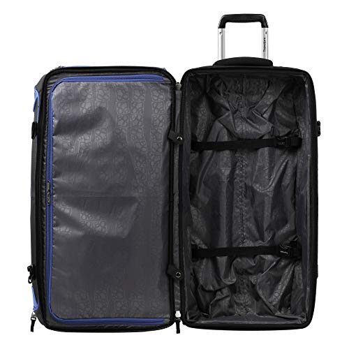 Details: No matter the adventure, this duffle bag is ready to roll. Built tough to withstand plenty of abuse, the bold by Travelpro rolling duffle delivers big on packability and includes a 2" zippered expansion option to boost capacity. Organization features include an interior mesh pocket built into the lid, a large, zippered, exterior-access wet pocket to keep damp or dirty items separated and adjustable hold-down straps that keep everything in its place. The drop bottom panel can be opened to create a bigger main interior compartment or zipped closed and used as a separate compartment ideal for hiking boots, equipment or heavier items-to add stability when upright. Exterior compression straps provide added security and adjust to condense the bag's depth when needed, and multiple cushioned neoprene handles make carrying comfortable. Uniquely styled and built for durability, this rolling duffle is made of rugged, high-density polyester fabric treated to resist moisture and stains and has reinforced wheel housings, skid guards and molded corner guards to protect high wear points. A strong, telescoping, aircraft-grade handle adjusts to users of different heights, while two high-performance inline skate wheels keep you rolling with ease. Backed by our Travelpro built for a lifetime limited warranty with the trusted companion promise.