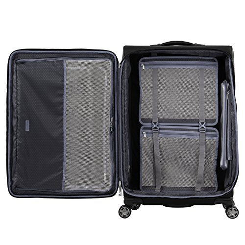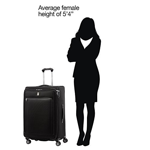 Details: Big is beautiful with the platinum elite 29" expandable spinner. The largest spinner in the platinum elite line, this top-of-the-line suitcase is built for durability with premium design details, including scuff-resistant, stain-resistant fabric, leather accents and chrome zippers. Ideal for long trips or multiple people, this bag helps prevent wrinkles with a Fold-out suiter, while keeping everything in its place with a deluxe interior tie-down system and integrated accessory pockets. A tip-resistant tapered expansion delivers up to 2" more packing capacity and an integrated lock allows TSA authorities to safely unlock and lock suitcase for inspection when needed (default lock code is 0-0-0 to open). Mobility is effortless with the precision glide system, which includes eight magnatrac self-aligning 360-degree spinner wheels guided by an adjustable PowerScope extension handle with patented Contour grip, ergonomically designed for a comfortable handhold and accented with soft, rubberized touch points. Backed by Travelpro built for a lifetime limited warranty with our trusted companion promise which covers the cost of repair for damage from airline or other common carrier for 1 year.