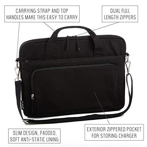 Details: Padded messenger-style laptop bag offers easy, hands-free carrying and protection from bumps, knocks and daily wear and tear. Top loading case fits most laptop models and brands with displays up to 15.6 inches. Has soft, anti-static lining and thick foam padding to protect your notebook or laptop against dust and damage. Two exterior zippered pockets are perfect for stowing phone, cables, adapters, chargers, pens, pencils, etc. Sleek, stylish design is great for work, school or leisure, and features durable fabric exterior, smooth gliding zippers, and a removable shoulder strap that adjusts from 27 inches to 50 inches. .Exterior dimensions are 15.75" X 1.5" X 11.25"