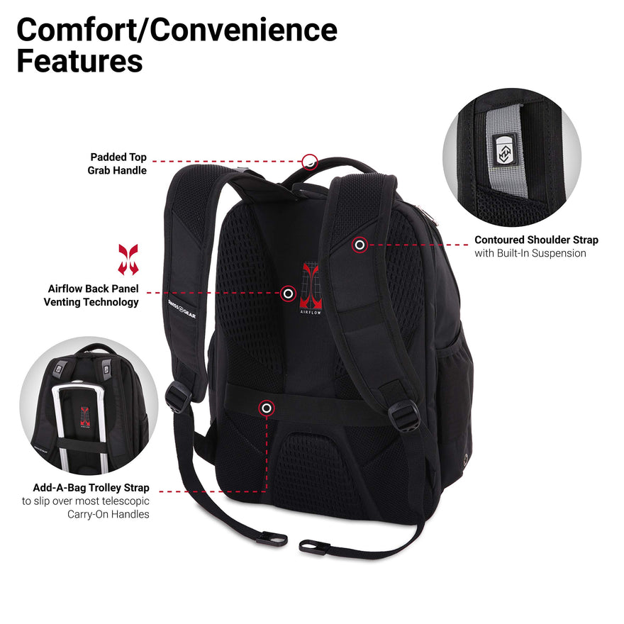 Details: Evolve your outdated briefcase into this modern Swissgear 5527 ScanSmart Laptop Backpack. Made from 900D fabric, its scratch-resistant exterior panel will keep your essentials protected while traveling or commuting in the city. Haul your 15" laptop and tablet within the ScanSmart compartment and get through TSA scanners easier with its embedded lay-flat technology. Keep your essentials intact inside its front organizer compartment, which is comprised of a key clip, divider pockets, and large double pockets. Find utmost utility from the fleece-lined sunglasses compartment, side stretch water bottle pocket, and side zippered accessory pocket. Reduce annoying sweat stains and strap on its mesh shoulder straps and Airflow back panel for maximum breathability on a long sweltering travel day. Make it airport-compatible and grip its padded grab handle from an overhead bin or slide its add-a-bag strap onto your luggage's handle for swiftness. Keep up with the grind of the city and consolidate all your executive must-haves within this resilient pack.