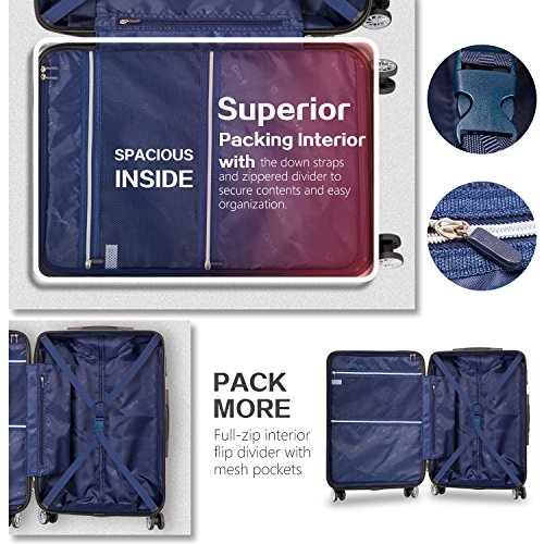Details: Designed for the modern traveller Made of lightweight and durable PC+ABS material, this luggage is crafted to resist impact. Soft touch top and side carry handles provide maximum comfort while travelling, and an integrated TSA-accepted combination lock will keep your belongings safe. Additional features include an expandable main compartment(28in only) for maximum packing capacity and silent, double spinner wheels. The protective film is not problem Peel off the protective film can be a headache, However, this is not the case this time, the most difficult part had already been peeled off by the factory, like the wheel and handle area, all you need to do is peel off the main body's protective film. As easy as pie. Features of the luggage 28inch is expandable for up to 15% additional packing capacity; 20inch is perfect carry-on, 24inch is ideal for personal or business trip. Handle: 3-step 100%pure aluminum telescoping handle for comfortable maneuvering. Wheels: four spinner wheels allow the suitcase to move seamlessly through 360 degrees of motion. Interior: The interior is fully lined with multi-use organizational pockets make it easy for packing clothes. TSA Lock: TSA lock for peace of mind. Measures: 20inch (15.4 x 8.7x 22.4), 24innch (17.3 x 9.8 x 26.4) 28inch (20.5 x 11x 30.3)(13in when it is expandable) Capacity: 20in38L , 24in60L, 28in 93L(110L when it is expandable) Weight: 20in 6.7lbs 24in8.1lbs 28in10.8lbs Travel days: 20in1~4days 24in4~7days 28in 7~9days
