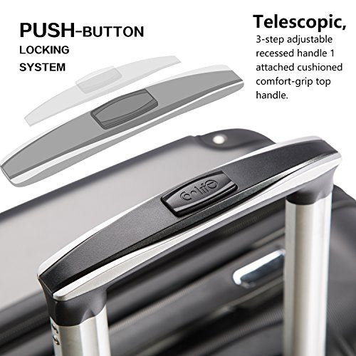 Details: Designed for the modern traveller Made of lightweight and durable PC+ABS material, this luggage is crafted to resist impact. Soft touch top and side carry handles provide maximum comfort while travelling, and an integrated TSA-accepted combination lock will keep your belongings safe. Additional features include an expandable main compartment(28in only) for maximum packing capacity and silent, double spinner wheels. The protective film is not problem Peel off the protective film can be a headache, However, this is not the case this time, the most difficult part had already been peeled off by the factory, like the wheel and handle area, all you need to do is peel off the main body's protective film. As easy as pie. Features of the luggage 28inch is expandable for up to 15% additional packing capacity; 20inch is perfect carry-on, 24inch is ideal for personal or business trip. Handle: 3-step 100%pure aluminum telescoping handle for comfortable maneuvering. Wheels: four spinner wheels allow the suitcase to move seamlessly through 360 degrees of motion. Interior: The interior is fully lined with multi-use organizational pockets make it easy for packing clothes. TSA Lock: TSA lock for peace of mind. Measures: 20inch (15.4 x 8.7x 22.4), 24innch (17.3 x 9.8 x 26.4) 28inch (20.5 x 11x 30.3)(13in when it is expandable) Capacity: 20in38L , 24in60L, 28in 93L(110L when it is expandable) Weight: 20in 6.7lbs 24in8.1lbs 28in10.8lbs Travel days: 20in1~4days 24in4~7days 28in 7~9days