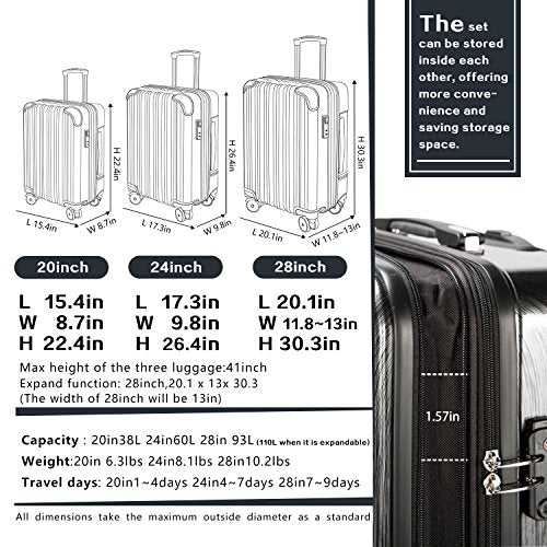 - Three different size: 20inch (15.4 x 8.7x 22.4), 24inch (17.3 x 9.8 x 26.4) 28inch (20.1 x (11.8~13)x 30.3), 28in is Expandable add 15%to the scalable space.