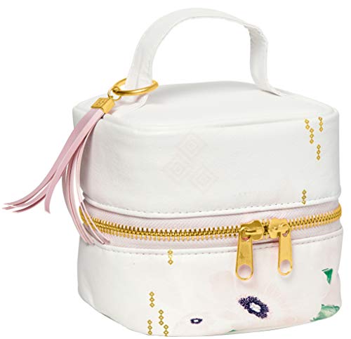 Details: Our travel bag is a hassle-free way to travel with your makeup, cosmetics, toiletries, accessories, and more. It features a white base, gold patterns, and pink tassel charm that contrast each other beautifully. This can also be combined with our large travel bags for a chic set. Includes (1) white and gold travel cosmetic and toiletry bag, measuring 4.5" w x 4.5" h x 4.5" D.