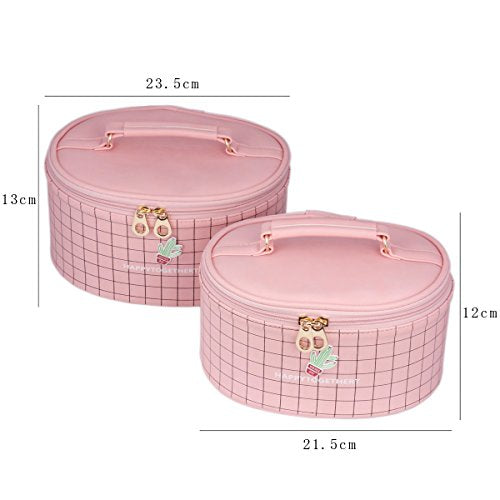 Details: Durable oval faux leather box design, checkered cactus patch pattern design on surface?classic and nice. The single top handle makes for easy toting. Slots and wide strap on the inner side of the lid help to keep brushes handy. Organizing and storing all your cosmetic, tools, toiletries, and accessories. Portable, great for travel or display on your home dresser. You can also store other gadgets, such as key chain. Double this style of box have same design. Large capacity must satisfy you. Dimension of large box: 23.5*18*13cm?9.25*7.08*5.11inches?. Dimension of smaller box: 21.5*16.5*11.7?8.46*6.49*4.6inches?.