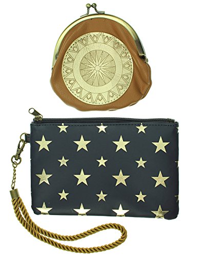 - Includes a Blue and Silver Starred Zippered Pouch with Detachable Lasso of Truth Wristlet, and a Kiss Lock Coin Pouch with Wonder Woman Themed Details.