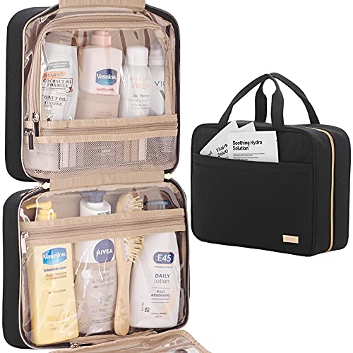 - Clear Compartment For Easily Access-4 clear zippered compartments, give you a viewing of your full-sized essentials, lotions, shampoo, powder foundation, allowing you to easily see where everything is and avoid digging. Inner see-through mesh pockets are a bonus
