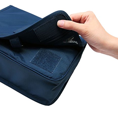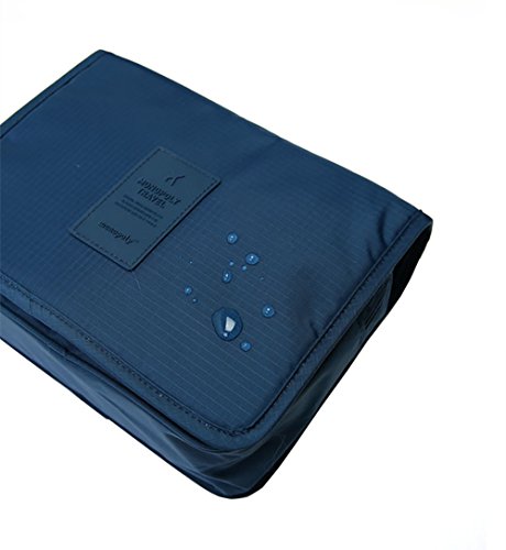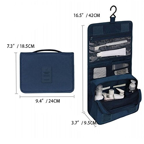 • Design: Zippered multi-compartments: 1 plastic pocket for toothbrush and toothpaste, 1 mesh pocket and 1 big pocket with dividers for toiletries and cosmetics. Foldable medium size approves airplane carry-on. Top handle for easy carry with hand, durable hook for easy hanging on the wall for space saving and convenient using